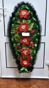 Ритуальный венок размером 100 × 40 см символизирует уважение и память. Выполнен с искусственными цветами, подходящими для траурных церемоний. Возможны наличная и безналичная оплата, оплата картой и почтовым переводом. При заказе ритуальных услуг вы получаете скидочную карту на памятник.
